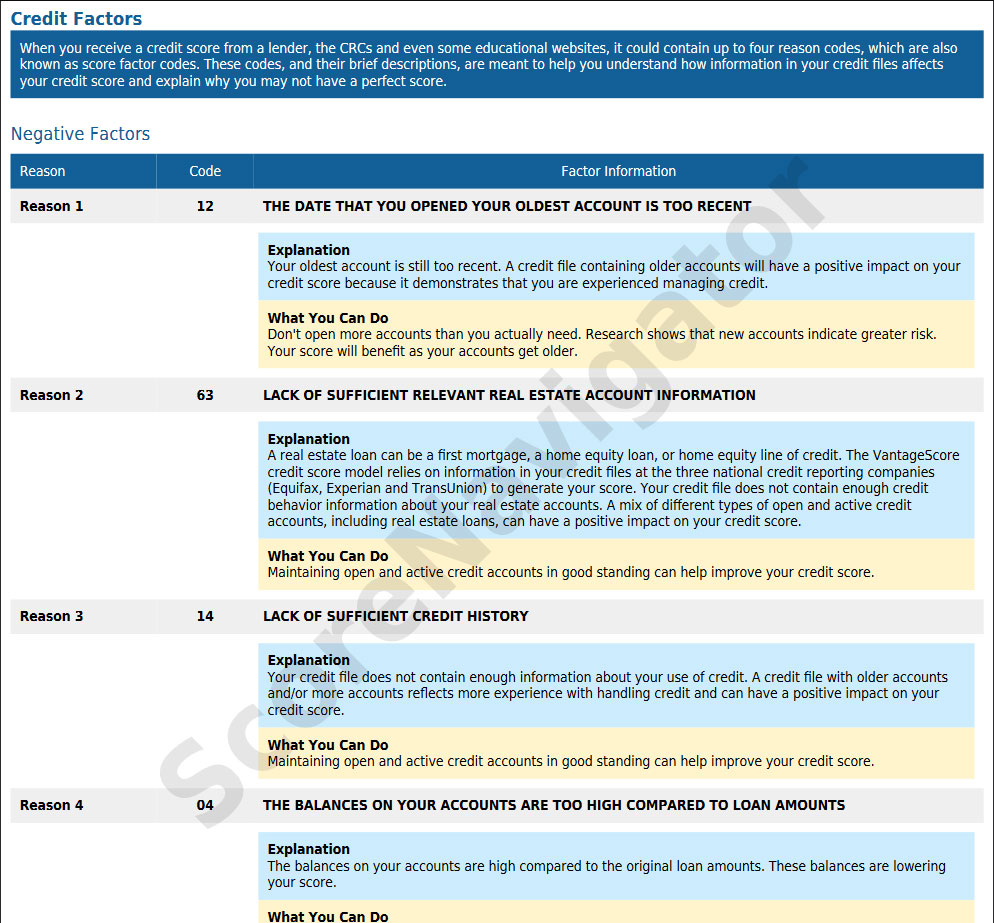 The Factors Report details up to four negative credit factors. The reason code and description are readily available, but ScoreNavigator provides enhanced factor codes, including factor explanations and actions need to be taken in plain terms. Positive Factors are given where available.
