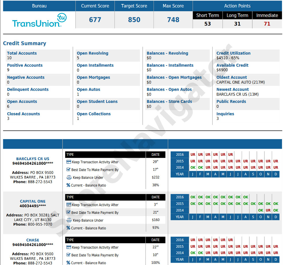 The Tradelines Report details all the specifics of each of the tradelines in a tri-merge format including ScoreNavigator's own Point Deduction Technology®. Accounts are separated grouped by type: positive, negative, collections and public records.